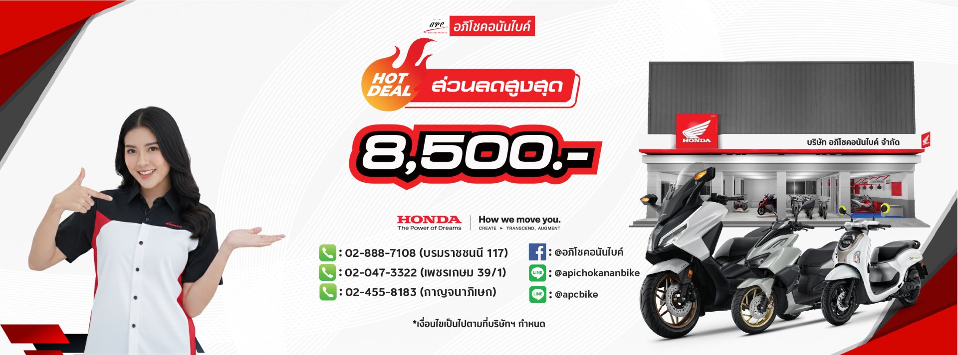 เป็นตัวแทนจำหน่ายรถจักรยานยนต์ และ อะไหล่แท้ฮอนด้า อย่างเป็นทางการ (Honda Wing Center) โดยมีบริการที่ครอบคลุมครบวงจร ไม่ว่าจะเป็นการซื้อ-ขาย รถจักรยานยนต์ใหม่, รถมือสอง, บริการหลังการขาย, ต่อหรือโอน ภาษี, พ.ร.บ. และ ประกันภัย รวมถึงงานทะเบียนทุกชนิด