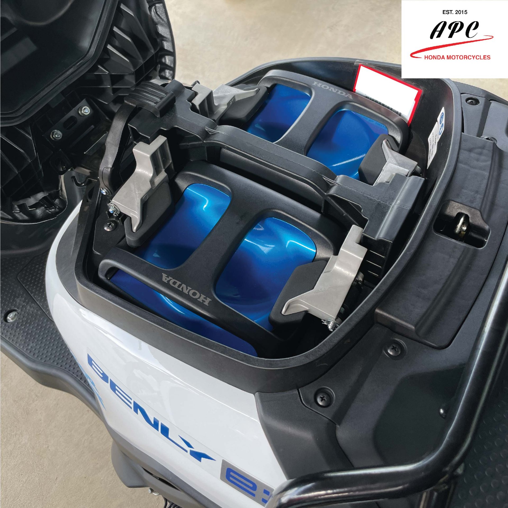 โดยแบตเตอรี่จะบรรจุอยู่ใน U-Box ใต้เบาะ การที่จะเปลี่ยนแบตเตอรี่นั้นก็สามารถทำได้ง่ายๆ โดยการดันสลักขึ้นหรือลงและดึงแบตเตอรี่ขึ้นเพื่อเปลี่ยน ฮอนด้าได้ใส่ออปชั่นเพิ่มเติมคือปลั๊กไฟที่สามารถดึงออกจากตัวรถเพื่อเสียบชาร์จกับไฟบ้านได้เลย (ไฟ 1 เฟส) ความรู้สึกในการขับขี่นั้นไม่ได้ต่างจากรถเครื่องยนต์มากนัก ใครที่กลัวว่าจะไม่ชอบรถไฟฟ้าอยากให้ไปลองดูก่อน ตัวรถเองให้ความรู้สึกที่ดี ทันสมัย ในส่วนของแรงบิดนั้นดีมากๆ การออกตัวที่พุ่งพร้อมที่จะแซงคันหน้าได้อย่างง่ายดาย เอาง่ายๆ ว่าขับสนุกเปิดคันเร่งปุ๊ป รถทะยานไปข้างหน้าทันที เบรกที่ให้มานั้นจะเป็น Disk Brake แบบ Combi Brake อีกหนึ่งอย่างที่เปลี่ยนไปอย่างชัดเจนคือเสียงรถที่เบาลง ไม่ถึงกับเงียบซะทีเดียวแต่ยังได้ยินเสียงมอเตอร์เบาๆ