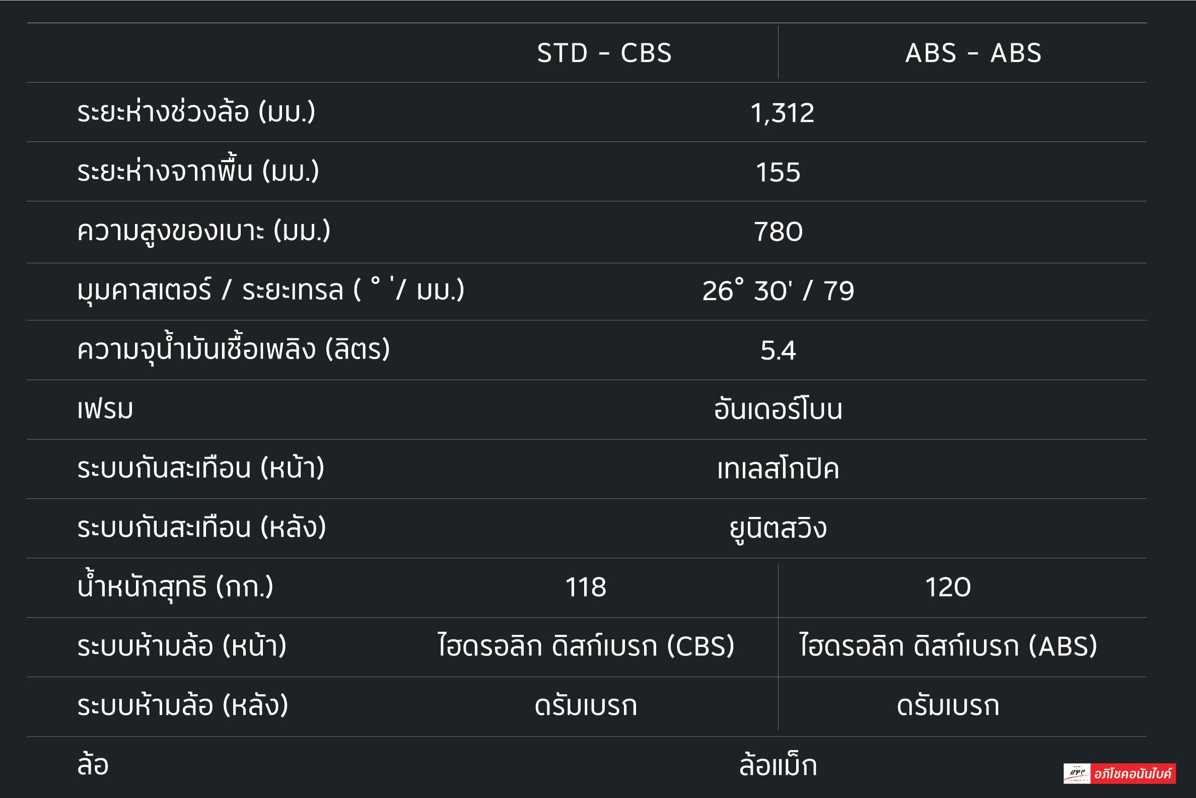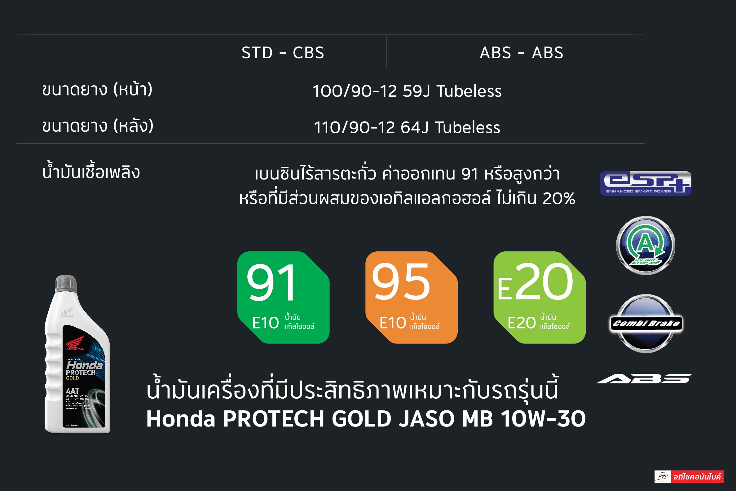 1) ระบบเบรกหน้า: ABS จะมีเบรกหน้า ABS / รุ่น CBS จะเป็นระบบ Combi Brake