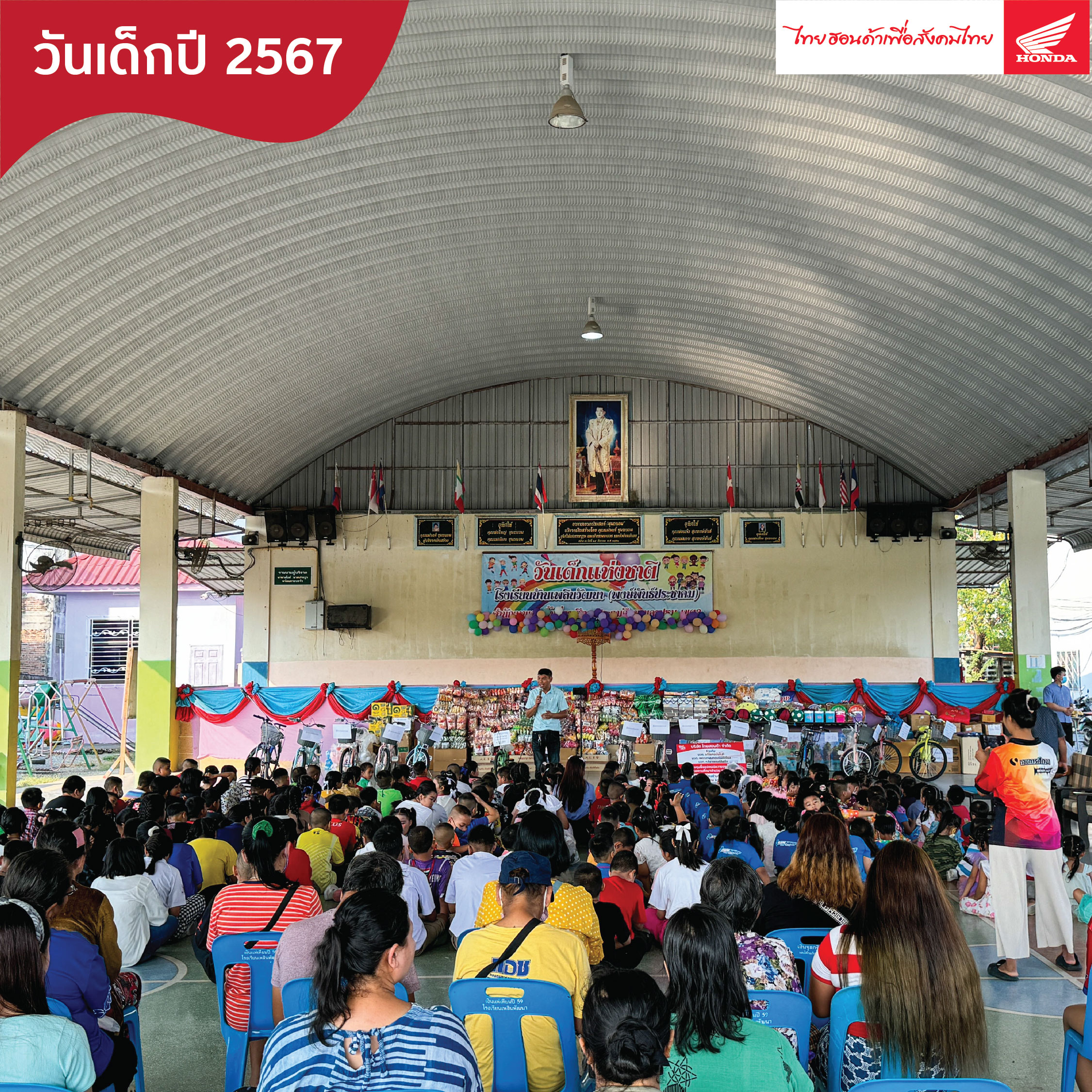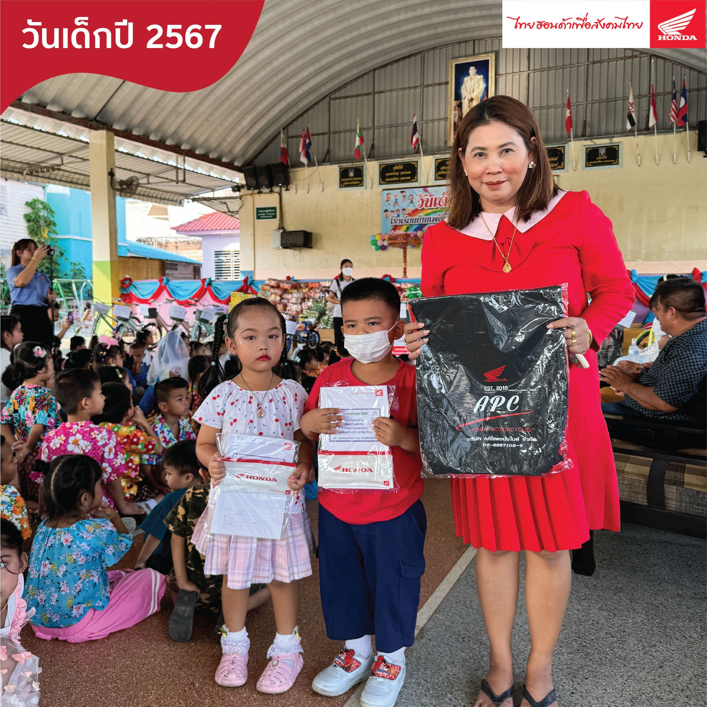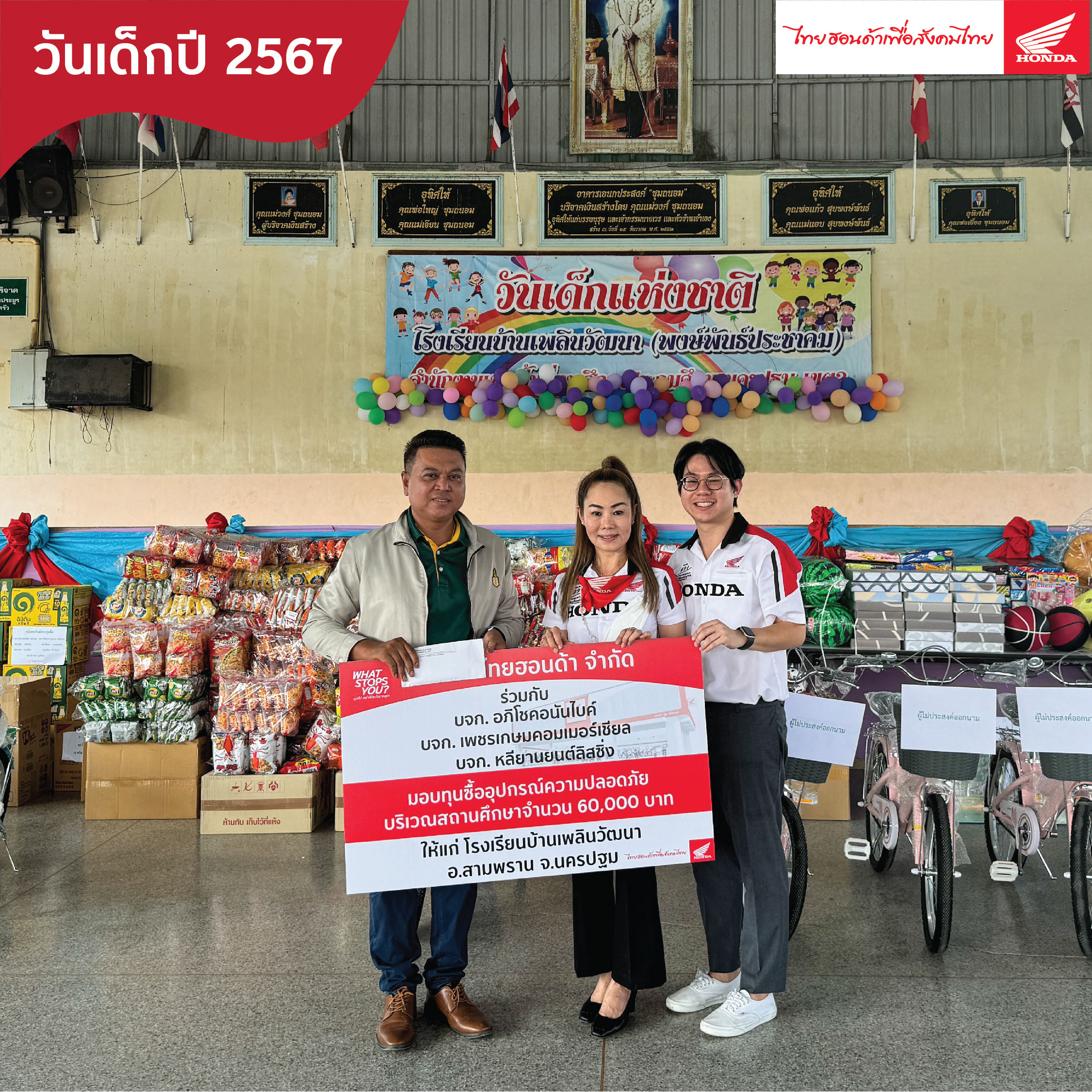 วันศุกร์ที่ 12 มกราคม 2567 บริษัท ไทยฮอนด้า จำกัด ร่วมกับ ตัวแทนผู้จำหน่ายรถจักรยานยนต์ฮอนด้า บริษัท อภิโชคอนันไบค์ จำกัด, บริษัท เพชรเกษมคอมเมอร์เชียล จำกัด, บริษัท หลียานยนต์ลิสซิ่ง จำกัด ได้สนับสนุนทุน 60,000 บาท เพื่อซื้ออุปกรณ์เพิ่มความปลอดภัยบริเวณสถานศึกษา และ อุปกรณ์การเรียนให้กับน้องๆ ในงาน วันเด็กประจำปี 2567 ณ โรงเรียน บ้านเพลินวัฒนา ถ.พุทธมณฑล สาย5 จ.นครปฐม