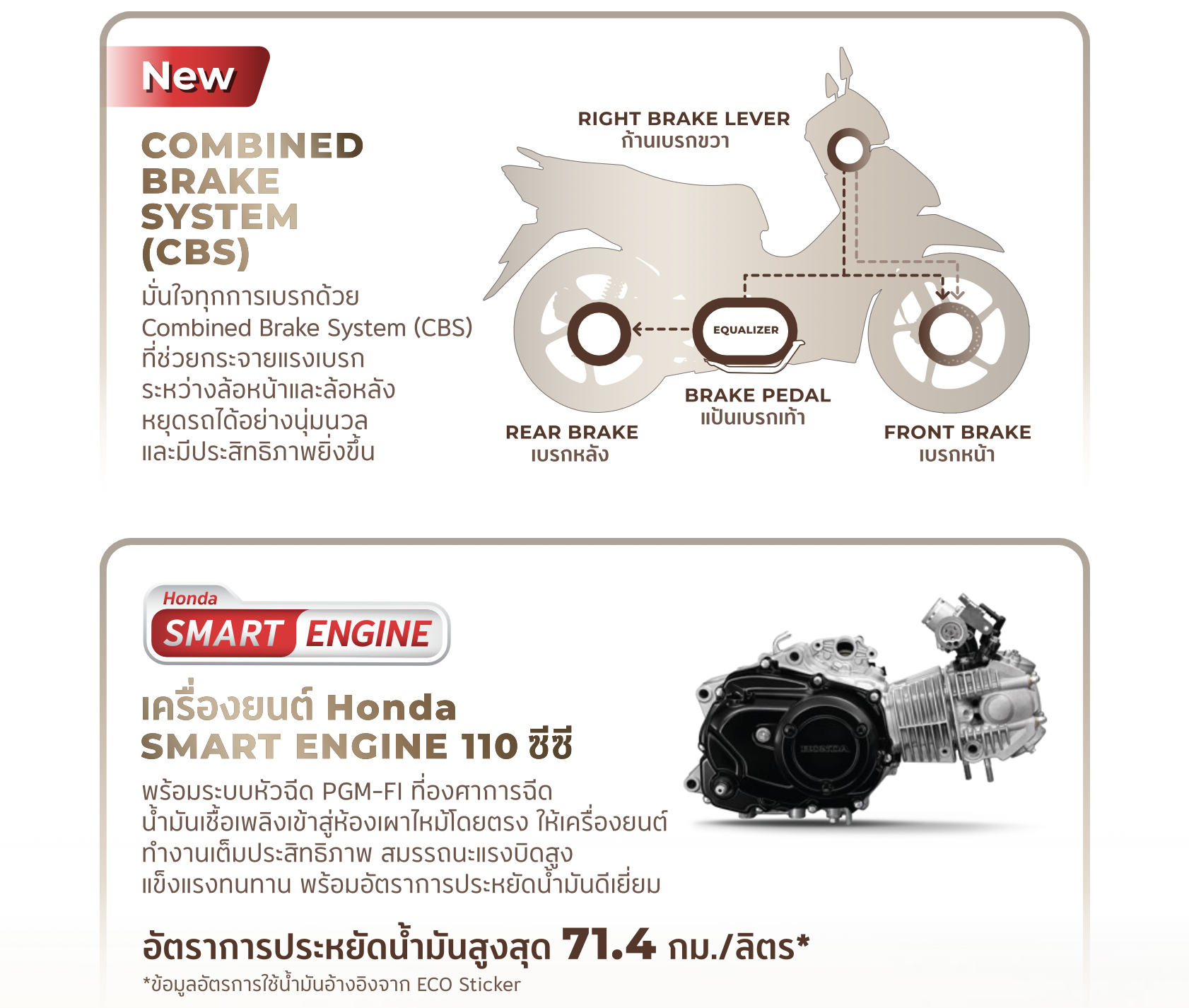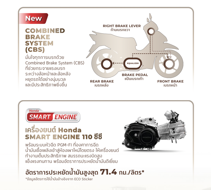 ส่วนของเครื่องยนต์ ยังคงเป็นเครื่องยนต์ตัวเดิม Honda Smart Engine 110 ซีซี ระบบหัวฉีด PGM-FI อัตราประหยัดน้ำมันสูงสุด 71.4 กม./ลิตร