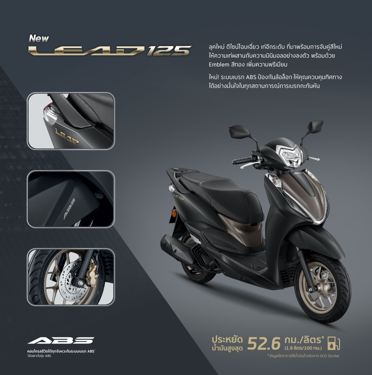 2. New Honda LEad125 ABS-  รุ่นระบบเบรก ABS ที่มาพร้อมกับ Logo emblem สีทอง สุดพรีเมียม ล้อสีทอง