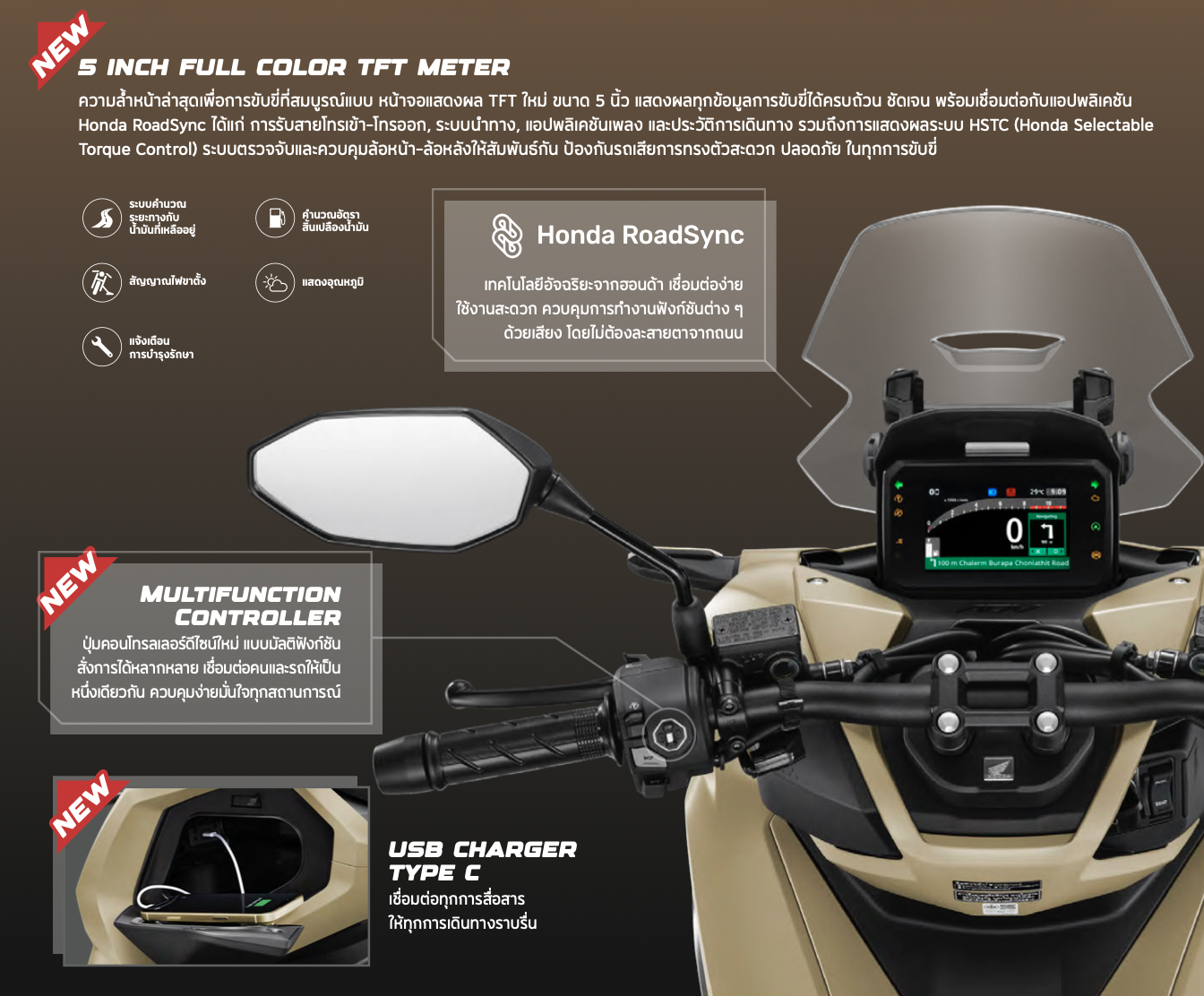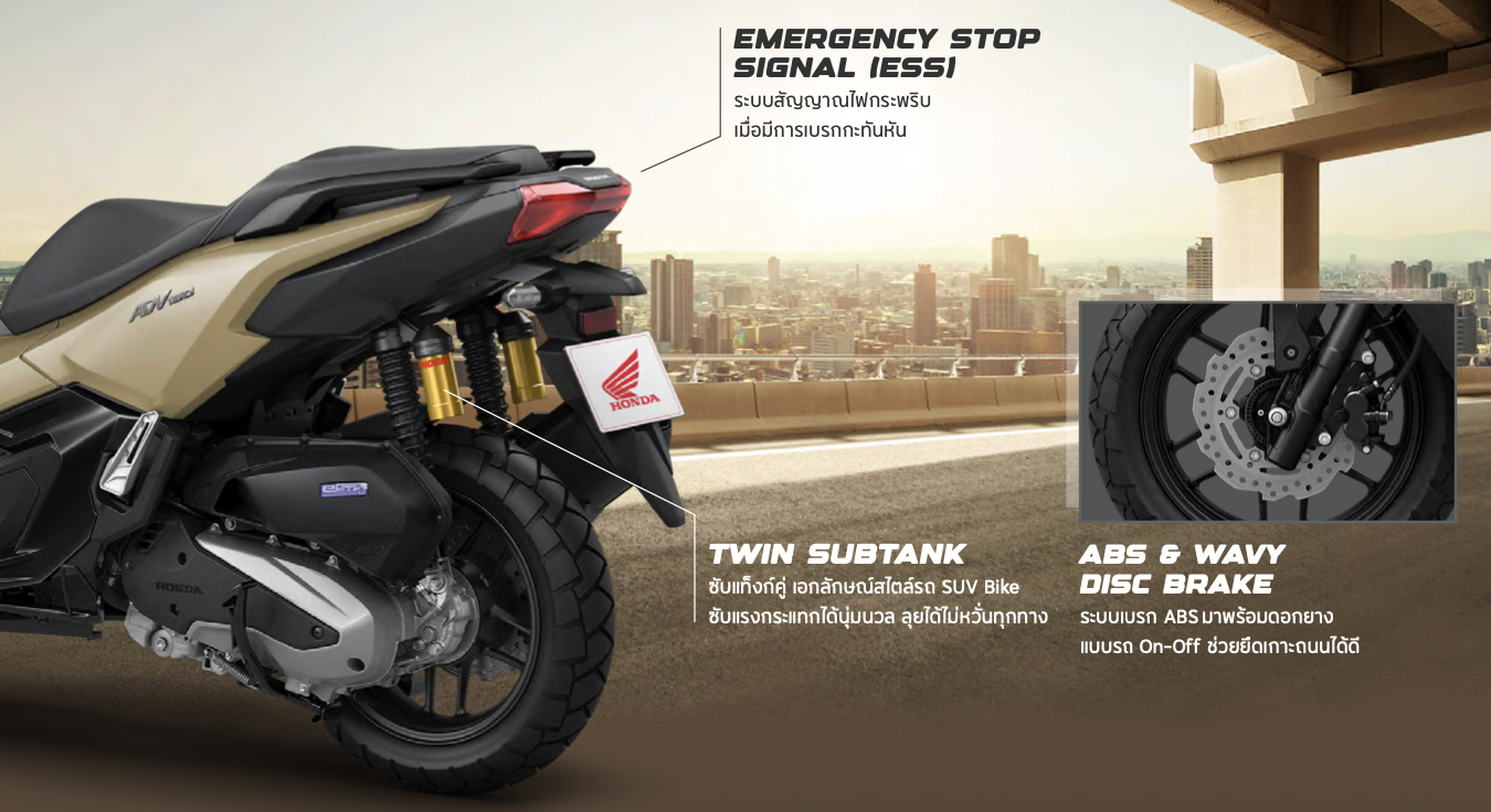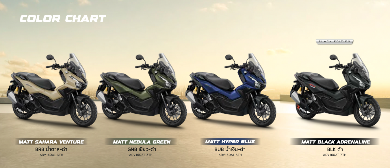New Honda ADV160 มาในคอนเซ็ปท์ "The Next Daily Adventure - เส้นทางใหม่ แห่งการผจญเมือง" ด้วยสีสันใหม่ และฟังกชั่นที่เพิ่มใหม่เข้ามา ไม่ว่าจะเป็น หน้าจอสี TFT ขนาด 5 นิ้ว พร้อมเชื่อมต่อระบบสั่งการด้วยเสียง Honda RoadSync นอกจากนี้ยังเปลี่ยนปุ่มควมคุมและที่ชาร์จเป็น USB-Type C ให้เรียบร้อยแล้ว